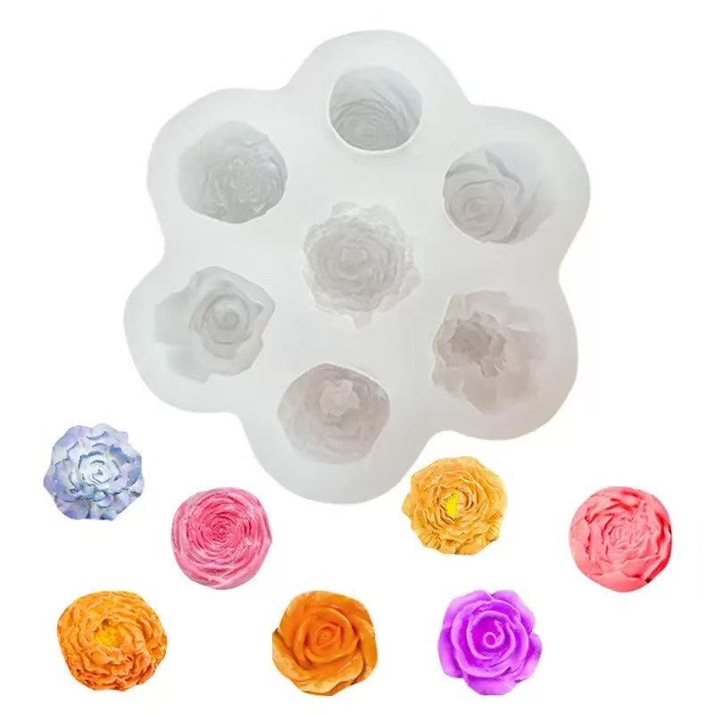 A premium 7-cavity floral cluster mold made from soft-flex, matte, milky-white silicone, engineered to cast 3D rose-top pillar candles with deep petal layering and crisp floral edges. Each cavity forms a different rose bloom pattern (stacked spiral, open rose, peony-style rose, classic rose, and hybrid petal layouts). The candle samples displayed below the mold show vibrant multi-color floral candles (yellow, orange, purple, blue, pink, red), proving its ability to retain definition even with dyed wax blends and gradient pours.