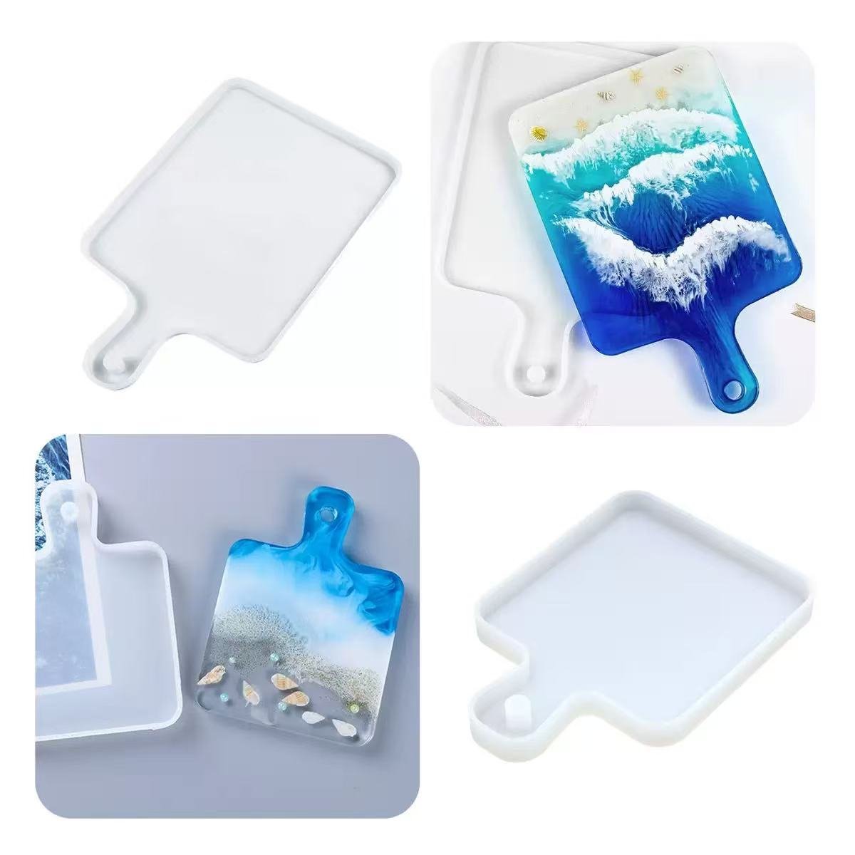 A rectangular resin casting mold shaped like a cutting/serving board, featuring a built-in handle extension for grip, hanging, and display. Crafted from high-elastic platinum-cure silicone, it is non-stick, odorless, BPA-free, and designed to deliver smooth, glossy, and sharply defined demolds.