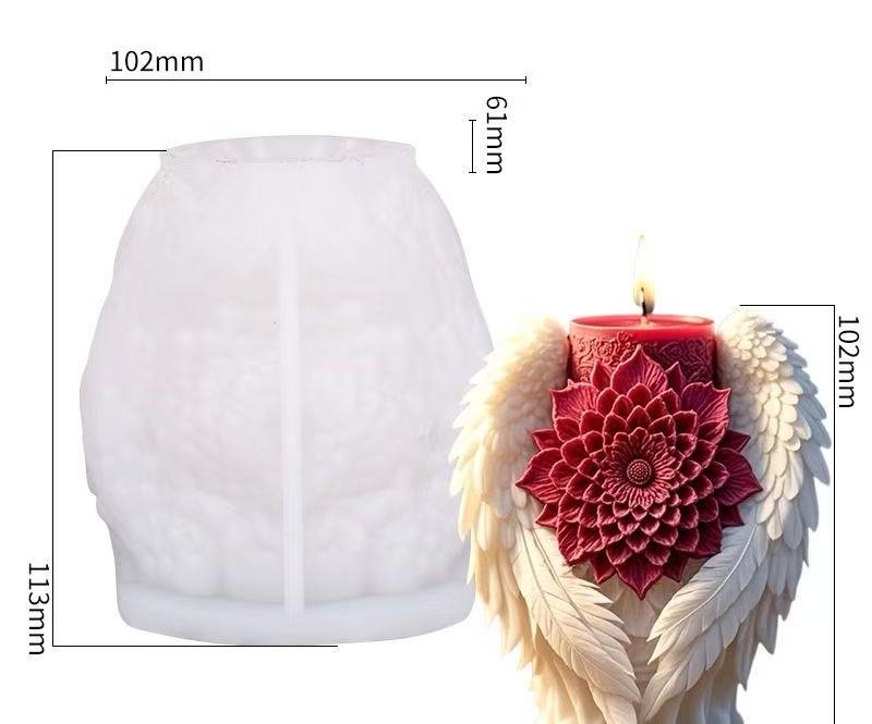 A decorative 3D silicone mold designed for high-end sculpted candles, featuring a detailed dahlia flower centerpiece flanked by symmetrical angel wings with feather texture that wrap into a soft-pillar candle body. The silicone appears smooth, flexible, matte, and lightly translucent, allowing precise detail retention for floral and feather lines. A finished candle sample (red-pink dahlia + cream feather wings) is displayed beside it to confirm the exact artistic output. Built for boutique décor candles, gifting sets, and seasonal statement pieces.