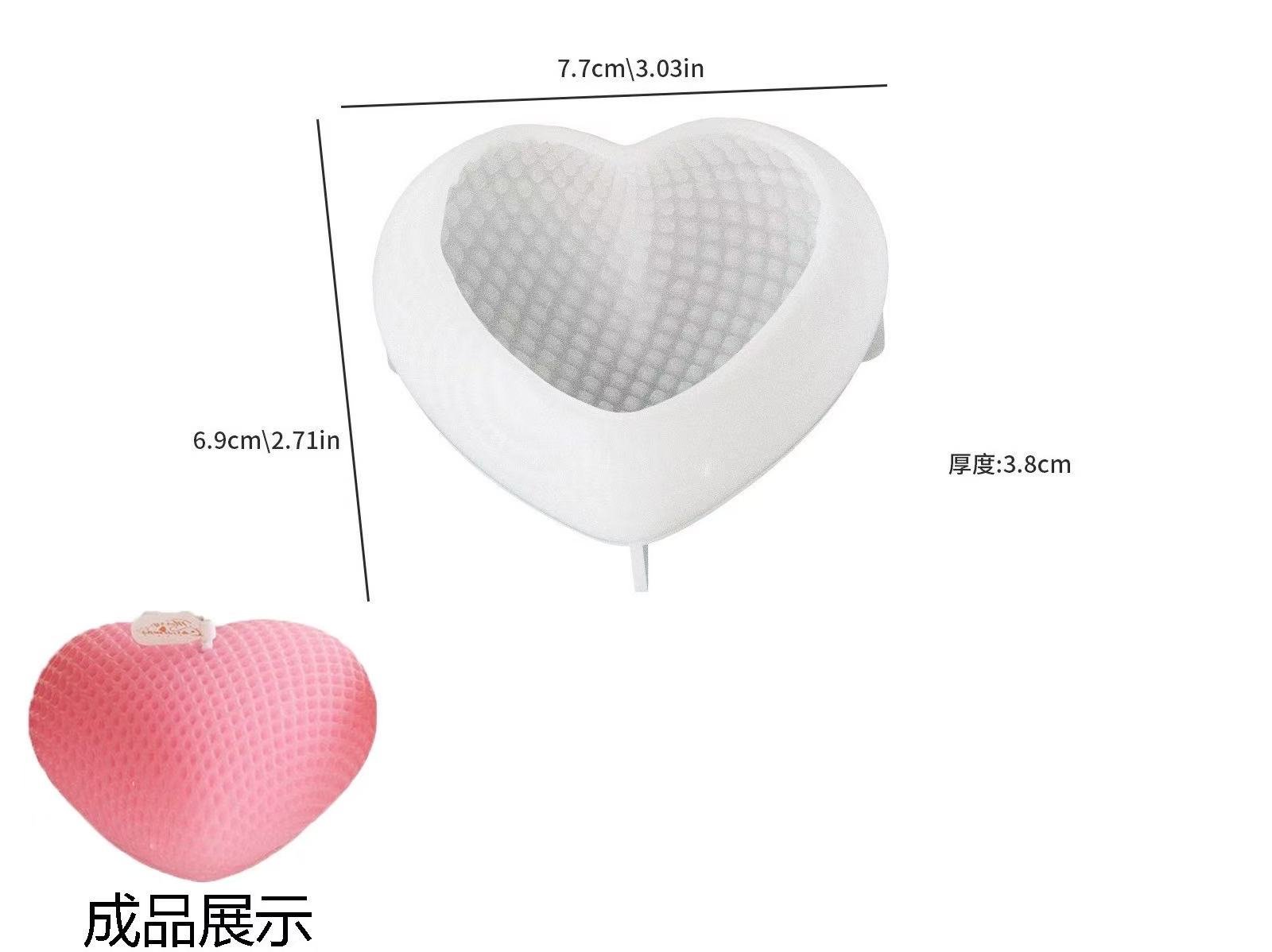 A heart-shaped pillar candle mold made from soft, flexible, matte white silicone with slight translucency, engineered for detailed wax imprinting and smooth candle release. The outer mold body features a quilted diamond texture pattern inside the cavity, giving the finished candle a premium stitched-style surface design. A finished candle sample in pink-red gradient wax is placed beside it, showing the exact heart silhouette, centered wick, and diamond-quilt embossing. The mold has a stable flat base and a top-center wick channel/hole implied by design for accurate wick alignment. The silicone material bends easily, allowing crack-free demolding even on textured surfaces. Built for décor, gifting, and seasonal candle collections, especially Valentine, holiday, or luxury floral-bundle themes.