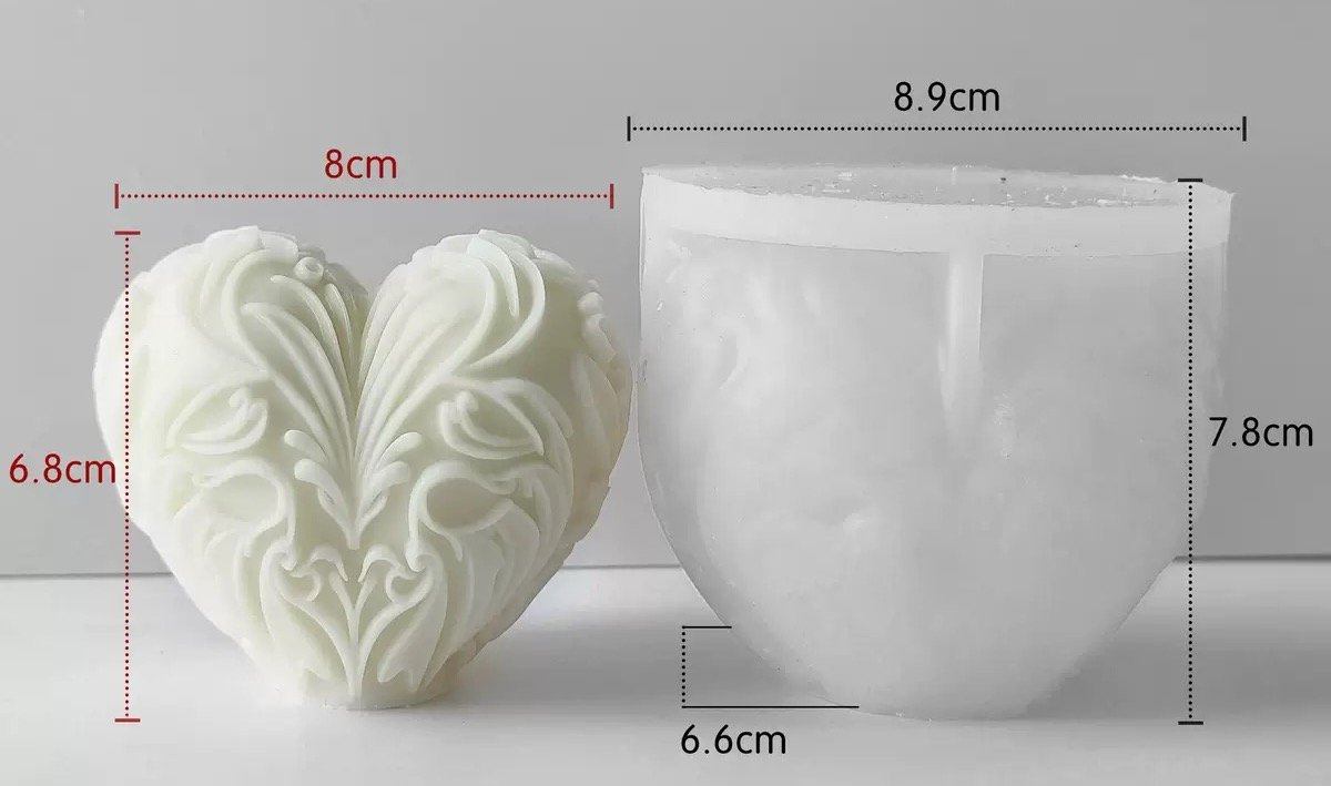 A premium silicone candle mold engineered to produce a solid heart-pillar candle with deep, symmetrical 3D embossed baroque-style swirl and leaf patterns. The mold transfers artistic curves and layered carvings into wax with high precision. Key features: