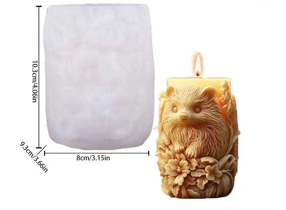 A pillar-style silicone candle mold featuring a 3D hedgehog relief positioned on the front body, surrounded by a dense embossed floral arrangement at the base, giving the finished candle a nature-craft, woodland-luxury aesthetic.
