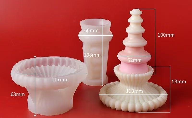 A 3-piece premium silicone candle mold set designed for the holiday season, consisting of a textured candle holder mold, a cylindrical body mold, and a layered Christmas tree candle mold. The molds are made from flexible frosted silicone, crafted to preserve fine layered and ridged details while ensuring easy wax release. This set enables elegant stacked candles and decorative bases for artisan candle décor and gifting. Key features: