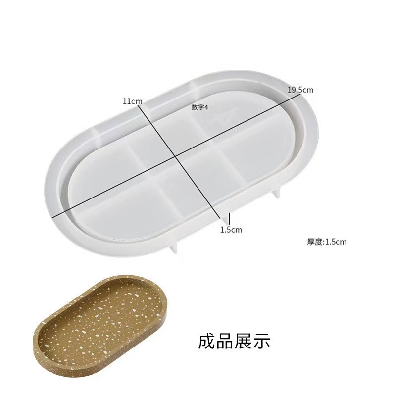 An oval tray casting mold made from flexible silicone, designed to reproduce terrazzo-style speckled patterns when casting with epoxy resin, gypsum/POP, plaster, or resin-gypsum composite blends. The mold features a smooth inner cavity, raised edges, and small support feet for stability during casting.