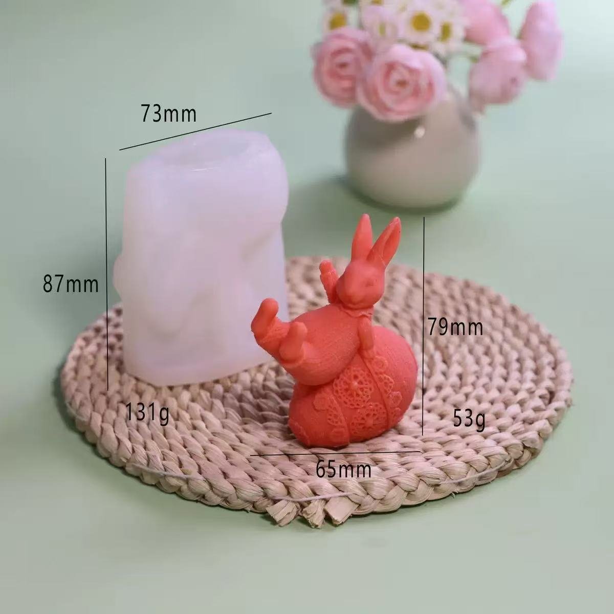 A detailed 3D silicone mold designed for casting rabbit-shaped figurine candles. The mold produces a sitting rabbit holding a round object (tealight/pillar base design), featuring fine lace-like quill/embossed patterns on the body, upright long ears, defined paws, and sculptural contours ideal for craft-grade candle making.