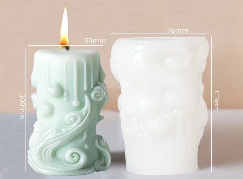 A premium cylindrical candle mold featuring an artistic 3D spiral wave emboss that wraps around the pillar body like flowing water or wind. Crafted from soft, flexible, milky-white matte silicone for smooth candle release and high-definition texture transfer. Key features: