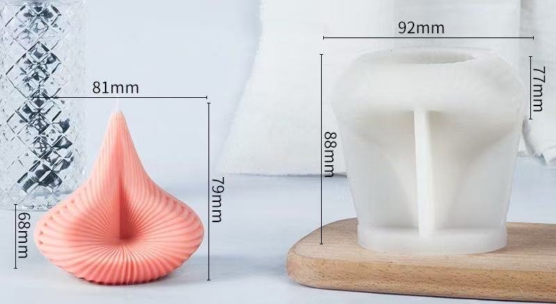 • A premium teardrop-shaped silicone candle mold built with tightly packed 3D wave ridges radiating inward, creating a spiral ocean-drop texture on finished candles. The mold body is made from soft, flexible, glossy translucent silicone (milky-white shown), engineered for clean release and detail preservation. Key features include: