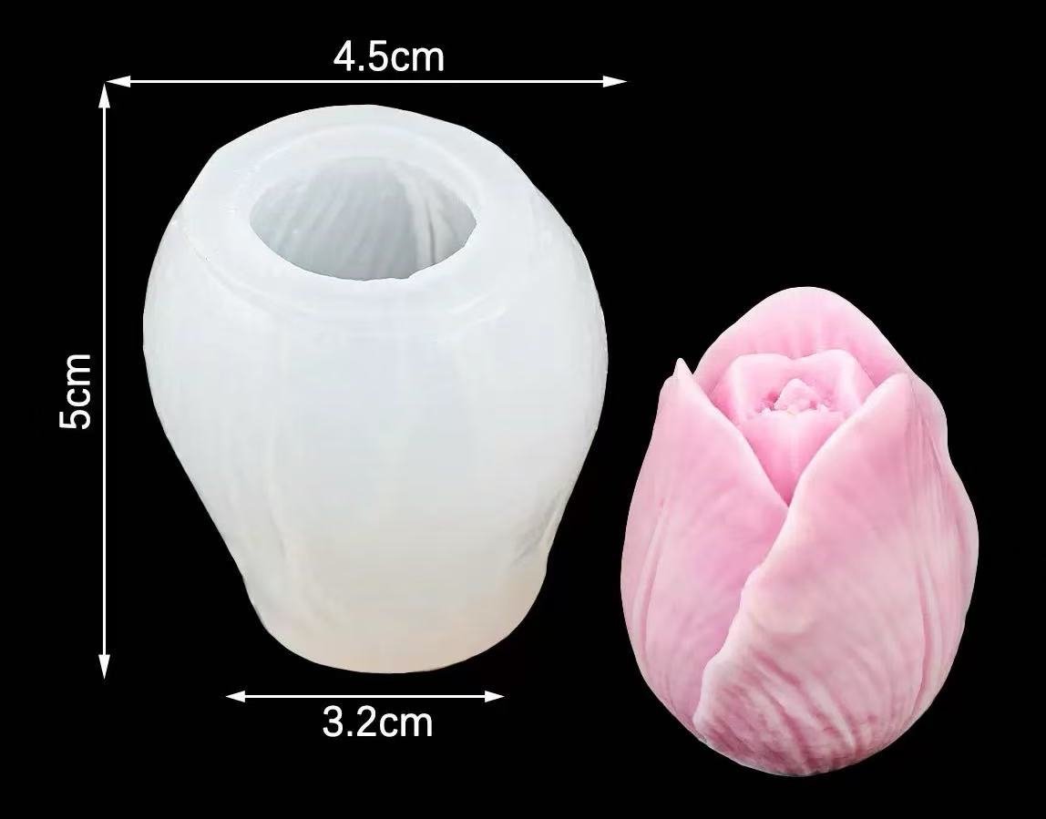 • The mold measures 5 cm tall, 3.2 cm bottom width, and 4.5 cm top opening, forming a tapered, realistic tulip-bud silhouette with natural overlapping petal-line details.